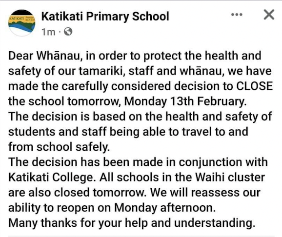 Information from our Principal about KKPS school closure on Monday 13th February due to Cyclone Gabrielle.